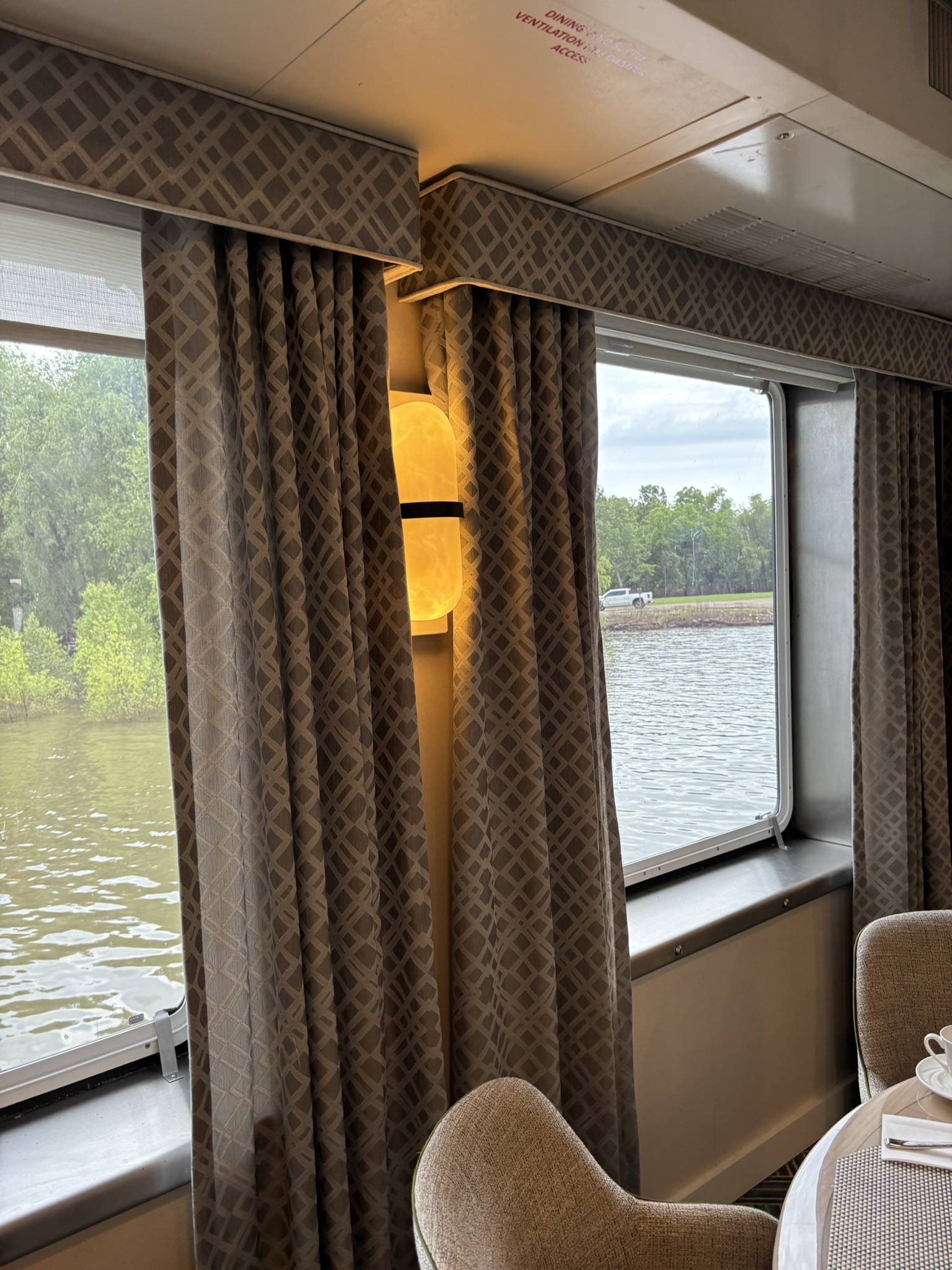 This drapery is found in the Restaurant. A cornice board in a matching fabric is installed above drapery. The fabric features a grey lattice (or diamond) pattern.