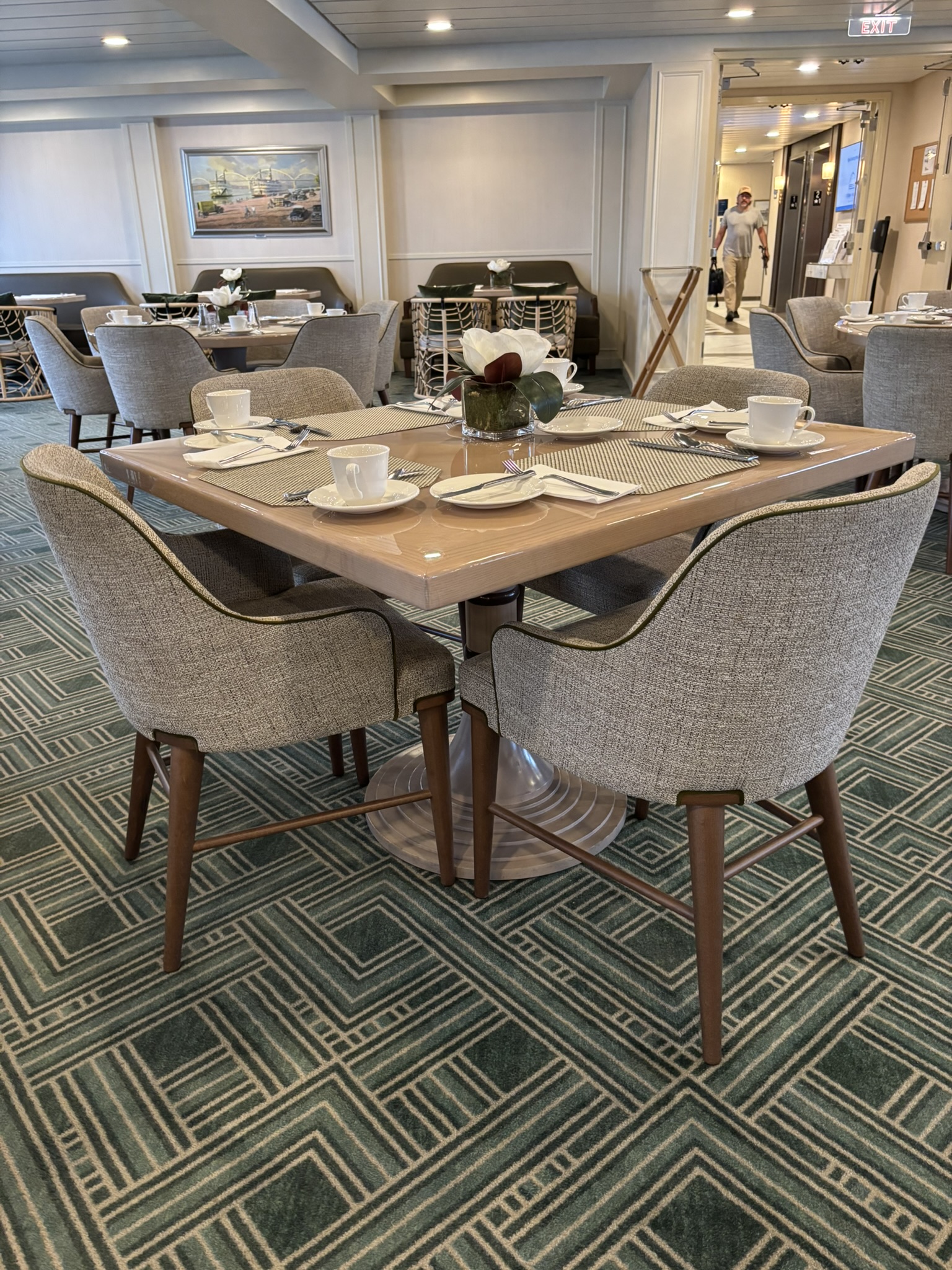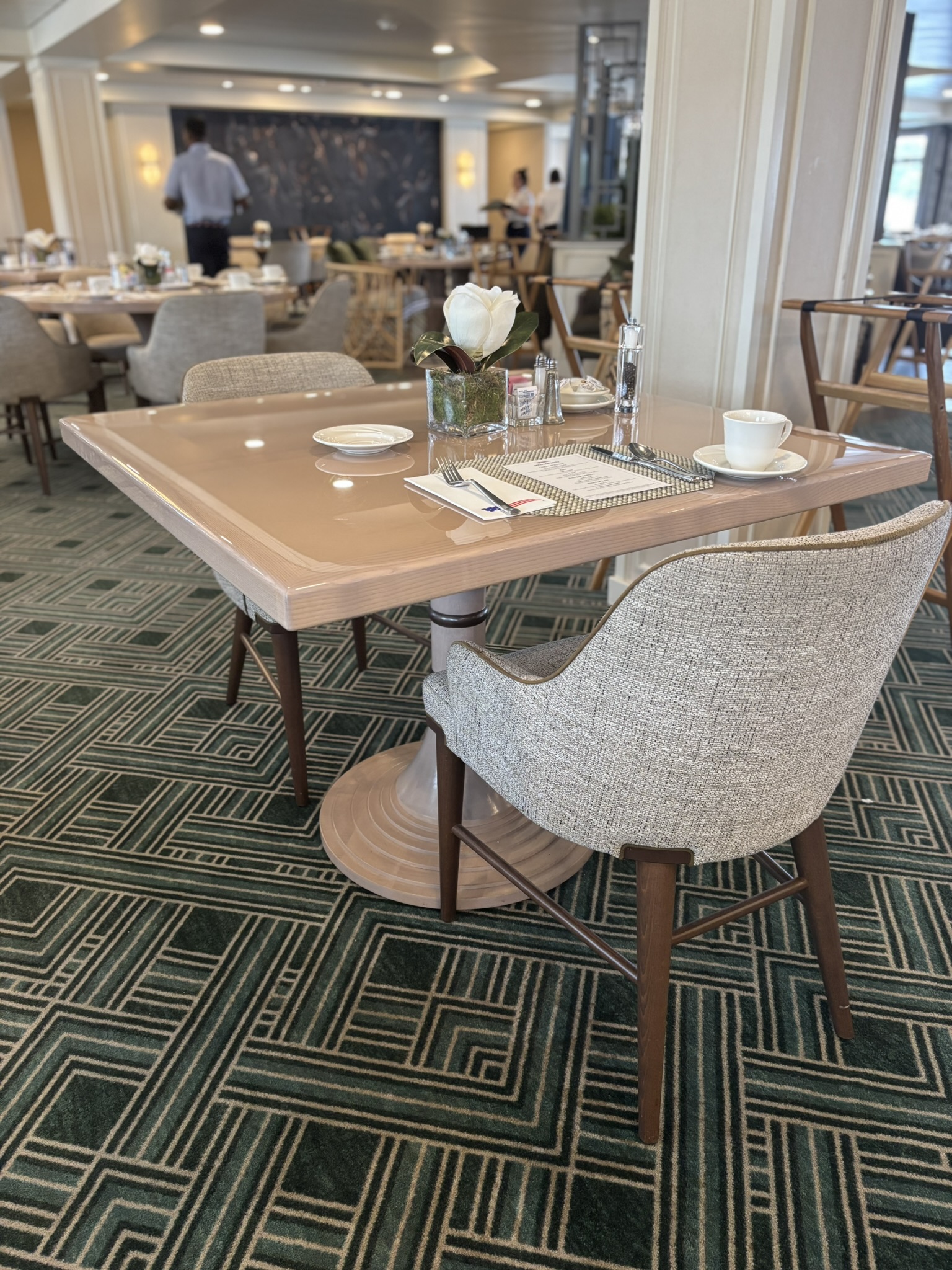 This custom square tabletop found in the restaurant can accommodate up to 4 dining chairs around it.
