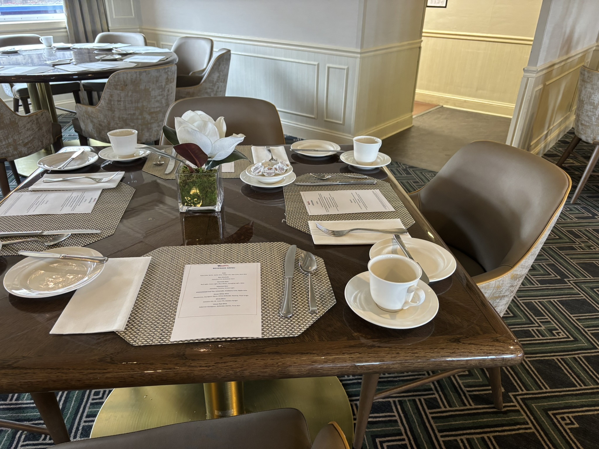 This custom square top dining table is found in the Restaurant. This table can accommodate up to four dining chairs around it. The table base is in a brass finish.