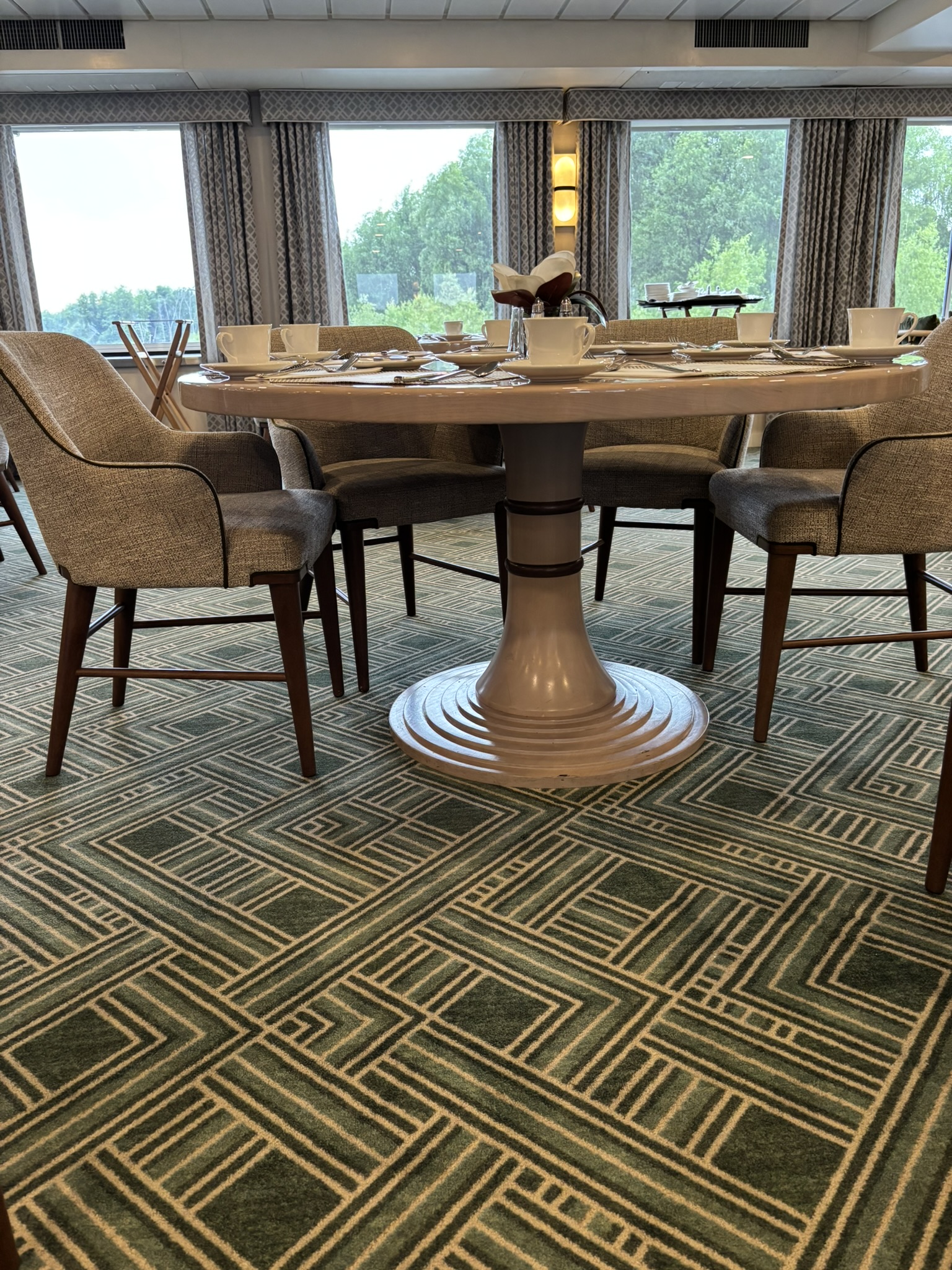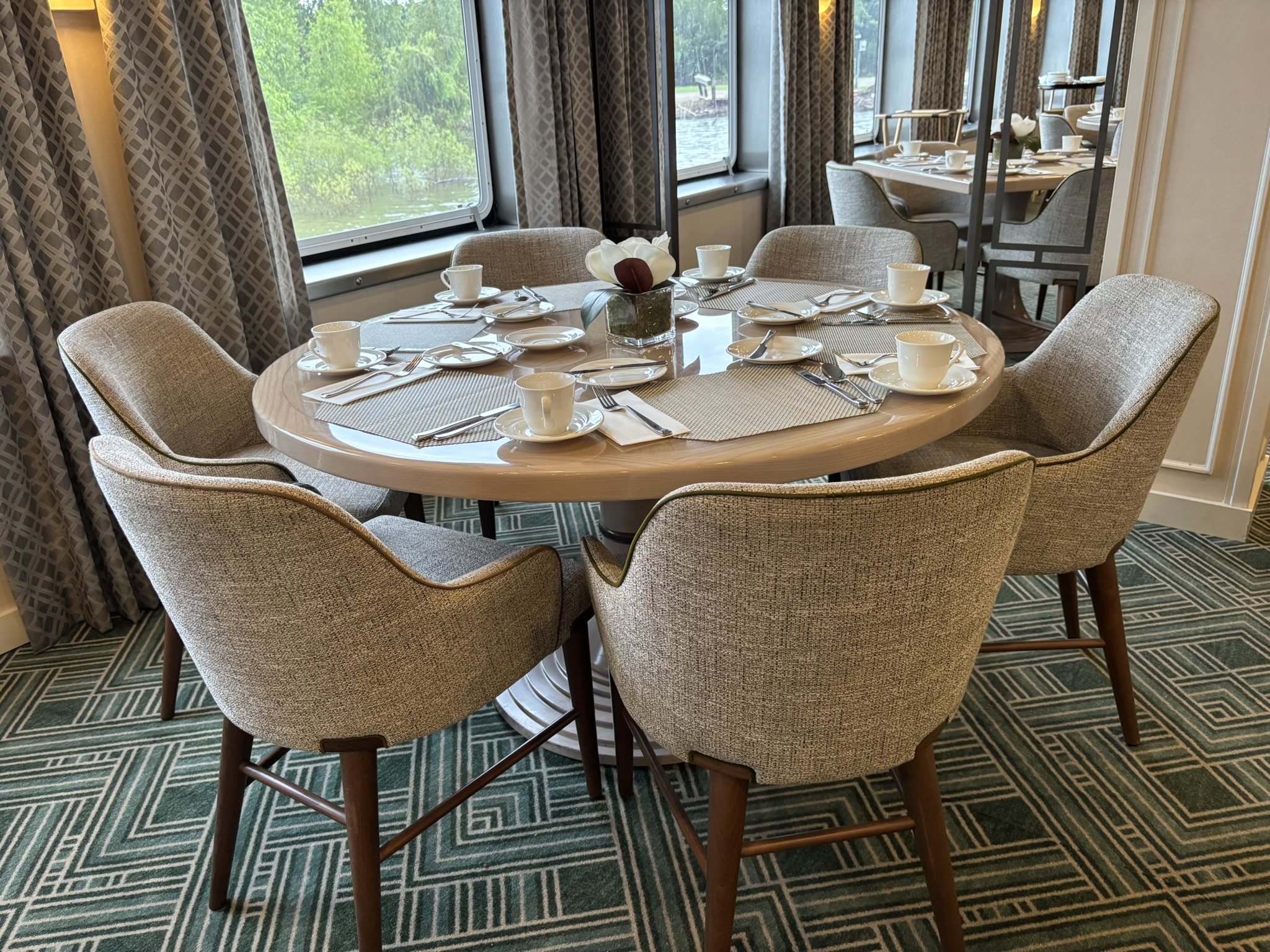 This round dining table is found in the restaurant. This table can accommodate up to six dining chairs around it.