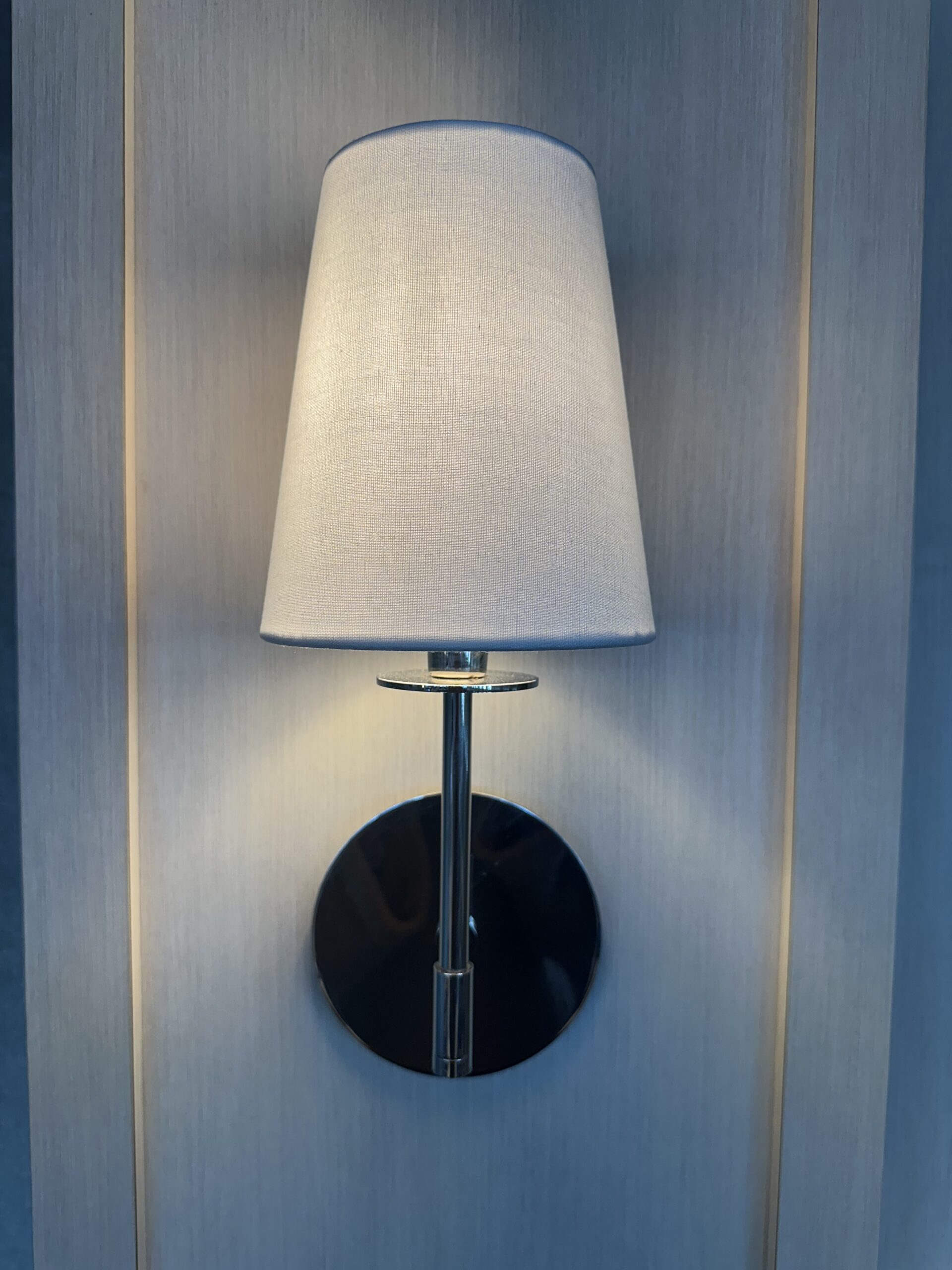 This is a thin silver sconce with a round backplate in the Forward Lounge. Each sconce has a lamp shade made of white fabric.