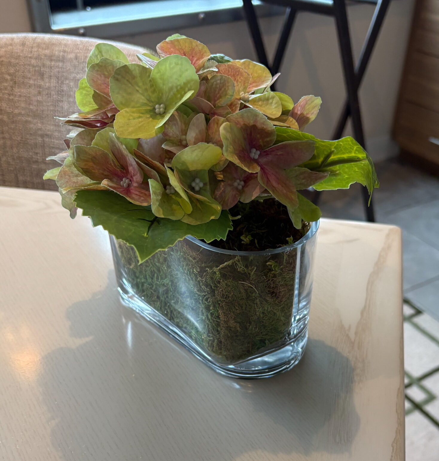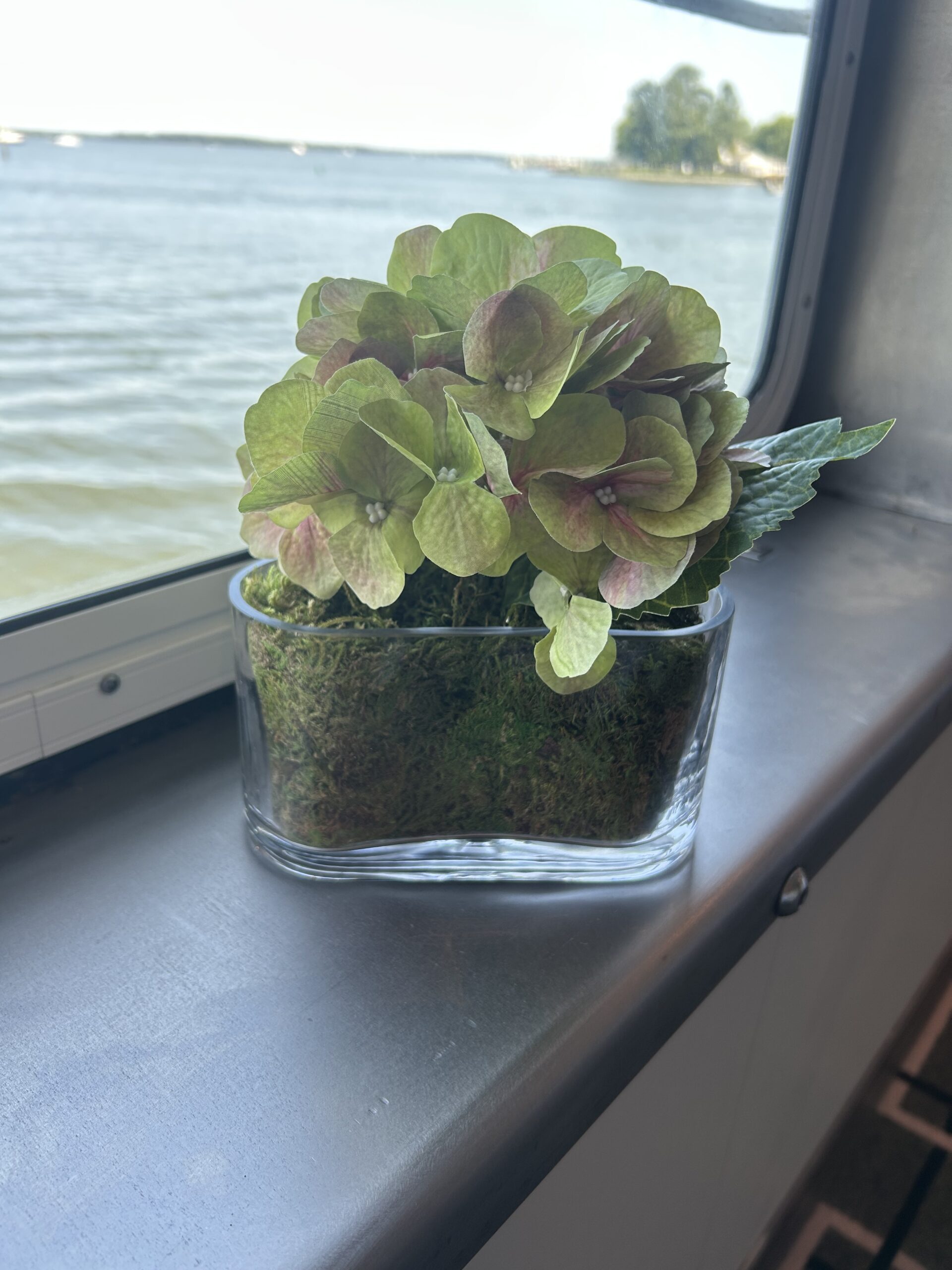 This centerpiece is found in the Restaurant. It is a green hydrangea in an oval glass vase.
