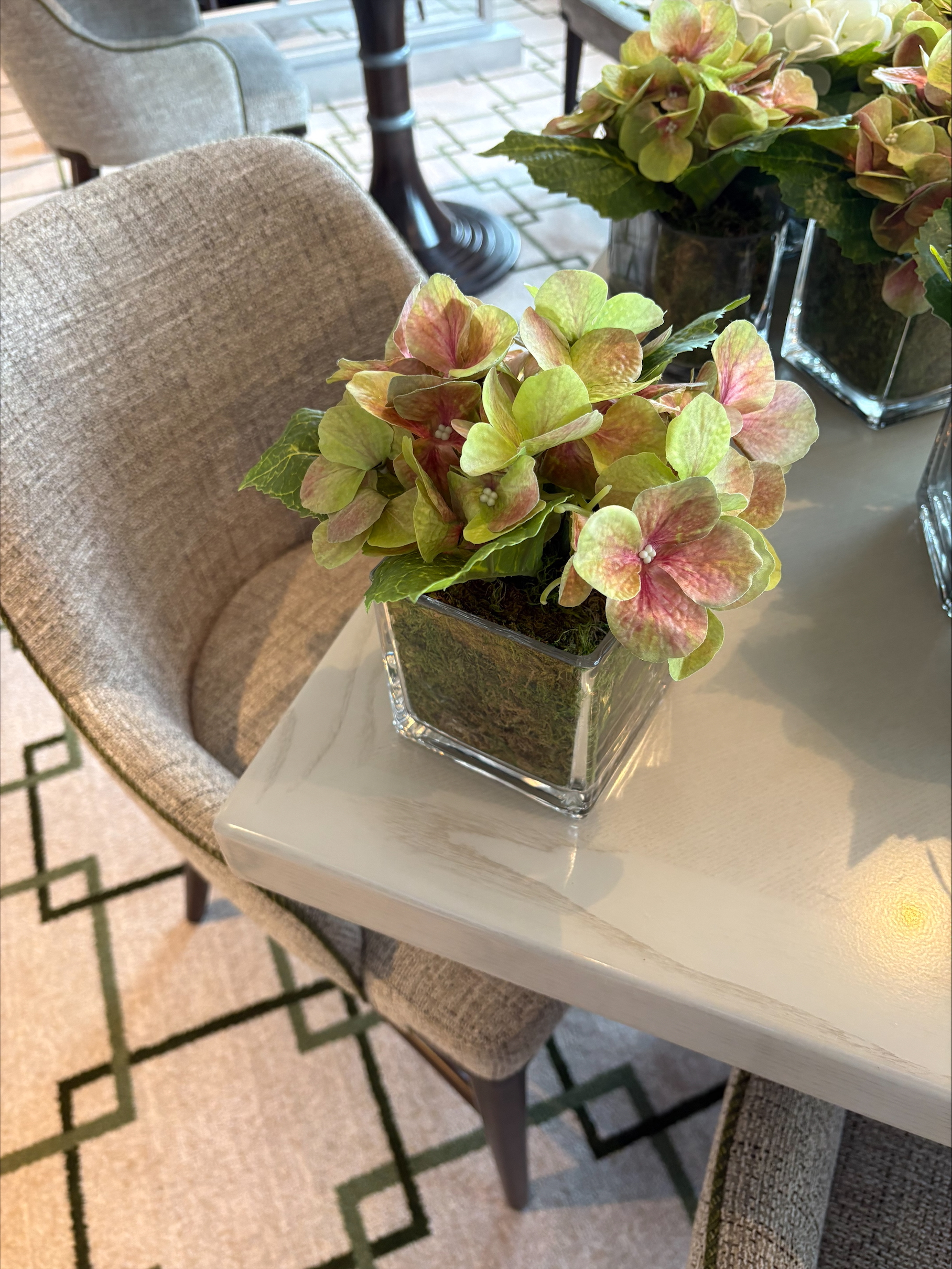 This centerpiece is found in the Restaurant. It is a green hydrangea in a square glass vase.