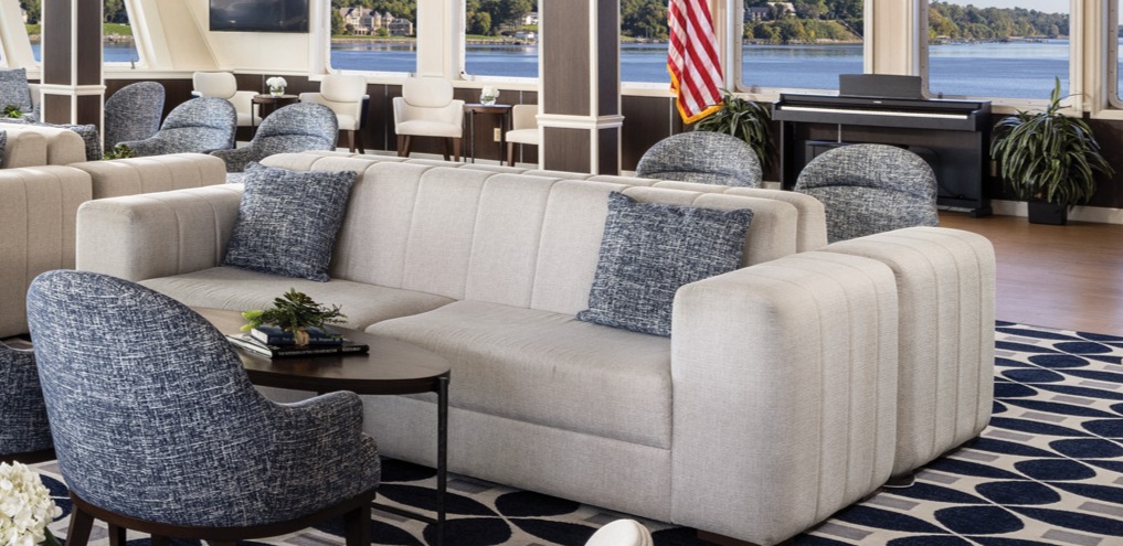Large Sofa with two blue and white pillows in the Forward Lounge.