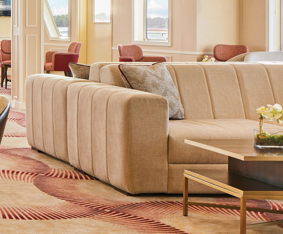 Large off-white sofa with two decorative pillows in the Forward Lounge. Each gray pillow has a red trim (or welt).