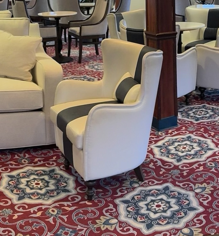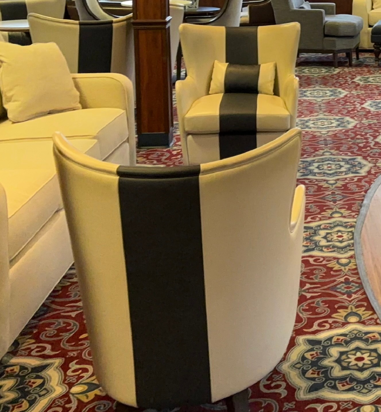 Lounge Chair with contrast stripe at the center of the chair (from the top to the bottom) with lumbar pillow (that also features a contrast stripe in the center) in Forward Lounge.