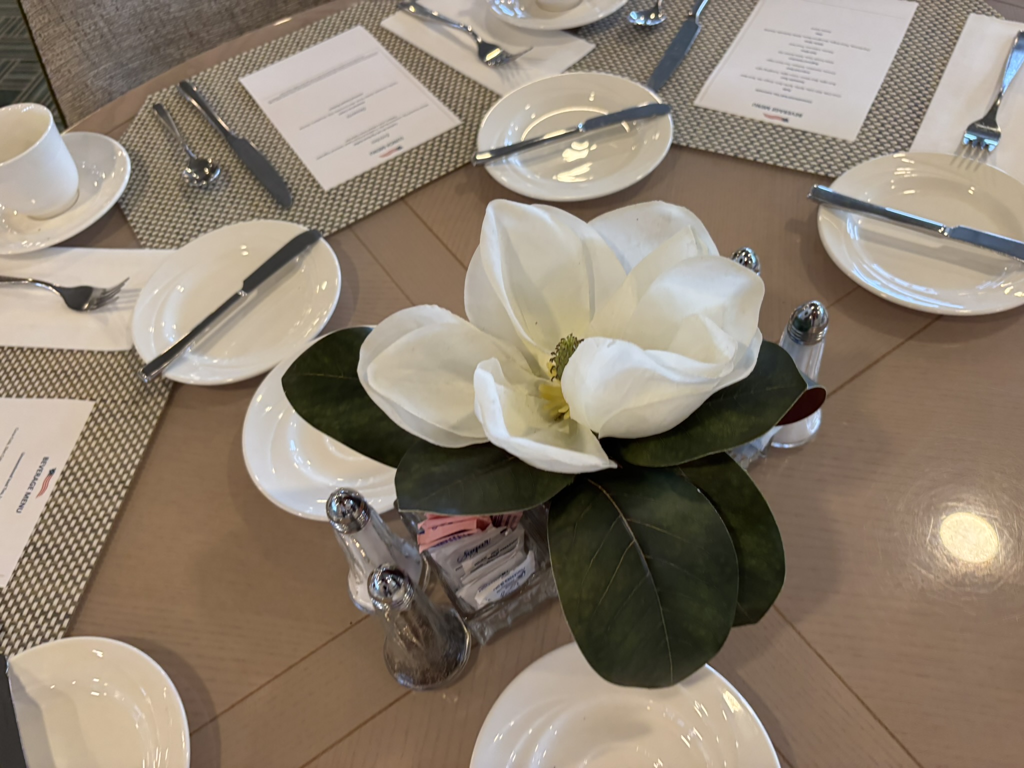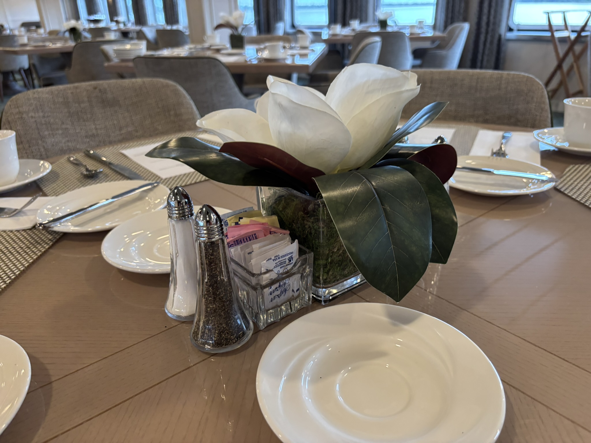 This centerpiece is found in the Restaurant. It is a white Magnolia in a square glass vase.