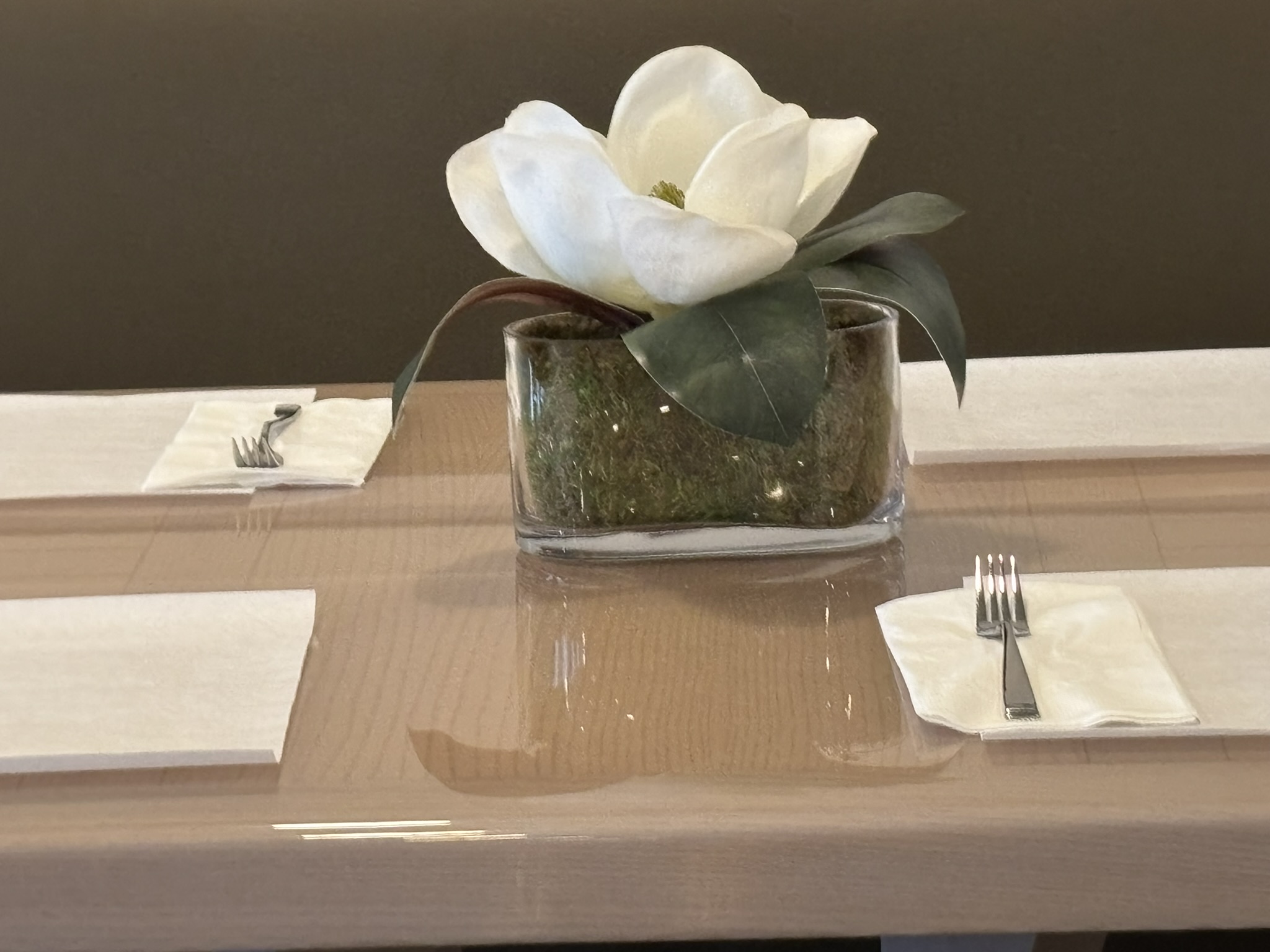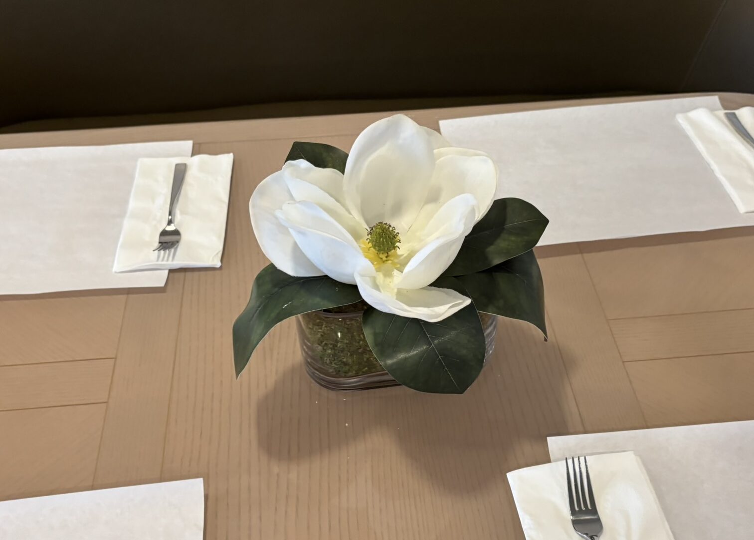 This centerpiece is found in the Restaurant. It is a white Magnolia in an oval glass vase.