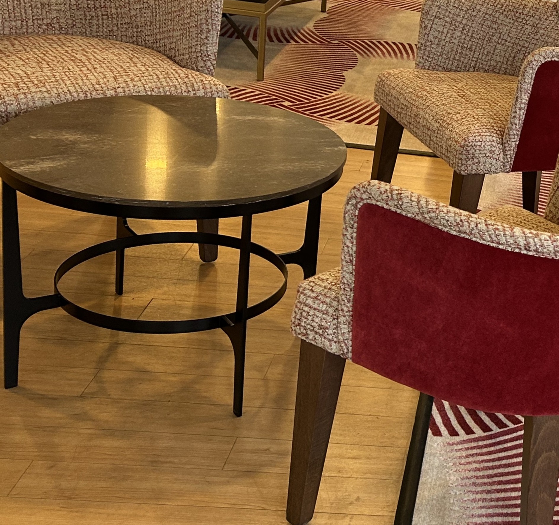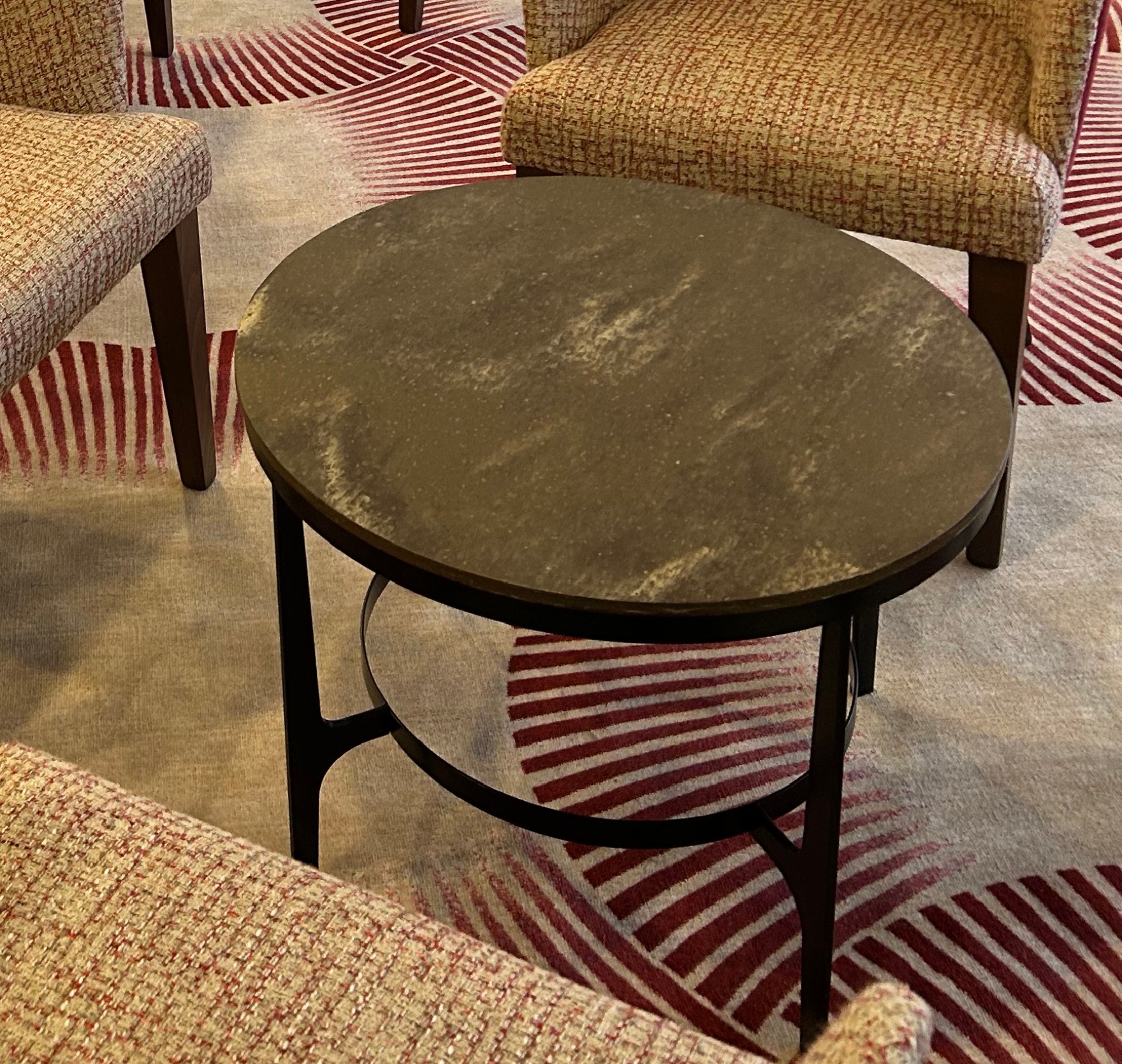 Round coffee table with custom brown top with black base and legs in Forward Lounge.