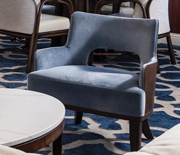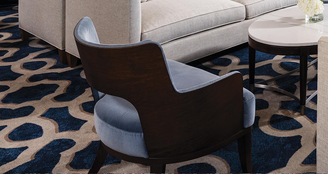 Custom open back lounge chair with exposed wooden frame in Forward Lounge.