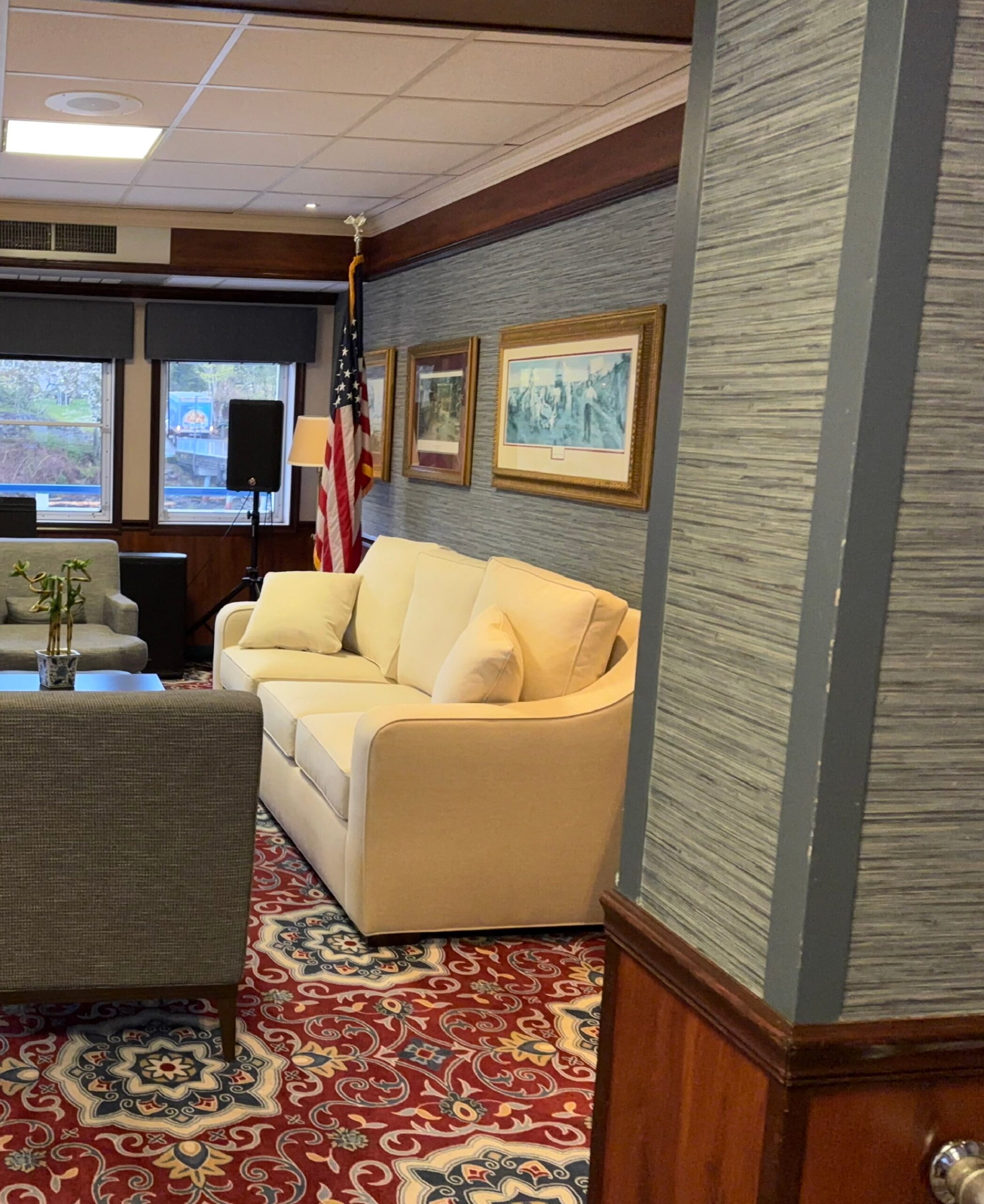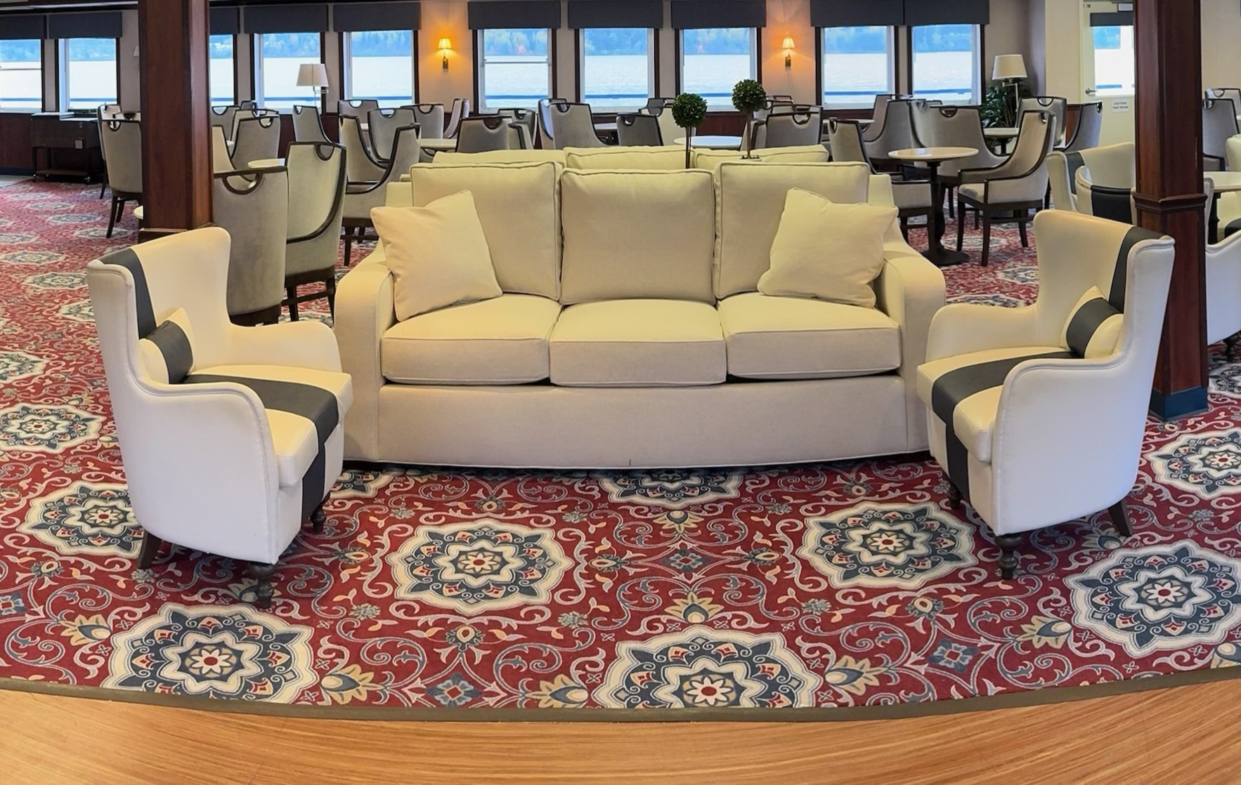 Sofa with two matching decorative pillows featured in the Forward Lounge.