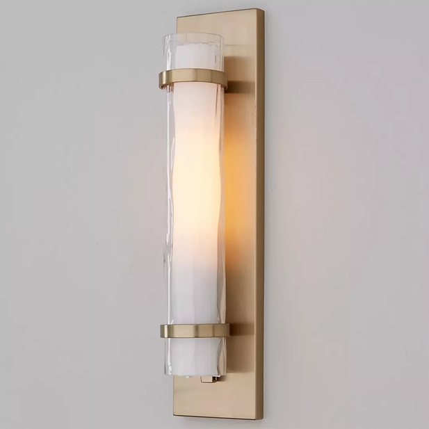 This wall sconce features two different glass shades. The outer glass is in a wave pattern and on the inside, it features a frosted opal glass.